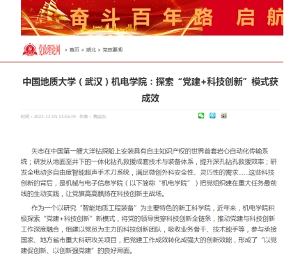 公司深化“以党建带动共建,以合作促进发展”的科研协作模式,积极拓展对外合作途径渠道,围绕“智能地质装备”行业发展的新态势,协同各科研团队,持续推进“产学研”融合发展,积极促进科技成果向工程一线、向现实生产力转化,为行业发展提供科技支撑。通过坚持党建引领下的目标导向,取得了本年度科研项目“质”、“量”双突破,到账总经费突破2千万元,其中获国家自然科学基金7项、参与合作获得了科技部国家重点研发计划3项、国家自然科学基金重点项目1项、湖北省重点研发计划1项、深圳市技术攻关重点项目1项。