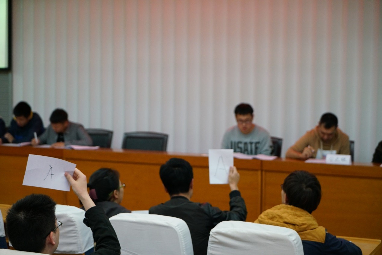 决赛形式为现场答题,答题环节分为小试牛刀、风险关口、争分夺秒,按三个环节得分总和决出前三甲。为保证比赛的公正公平,本次决赛邀请了公司辅导员丁钰峰老师、买买提·艾尔肯老师、院研究生会陈霖、院员工党建办公室黄仕恒组成比赛的公正组。决赛赛场气氛激烈,各参赛队伍你追我赶、互不相让,经过前两个环节的比拼,各队成绩不分伯仲,可见选手们对相关知识学习充分、掌握牢靠。