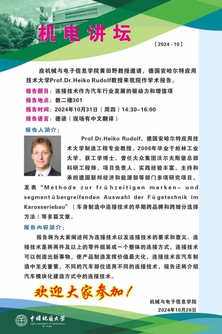【10月31日】机电讲坛(2024-10):德国安哈尔特应用技术大学Prof.Dr.Heiko Rudolf教授来公司作学术报告