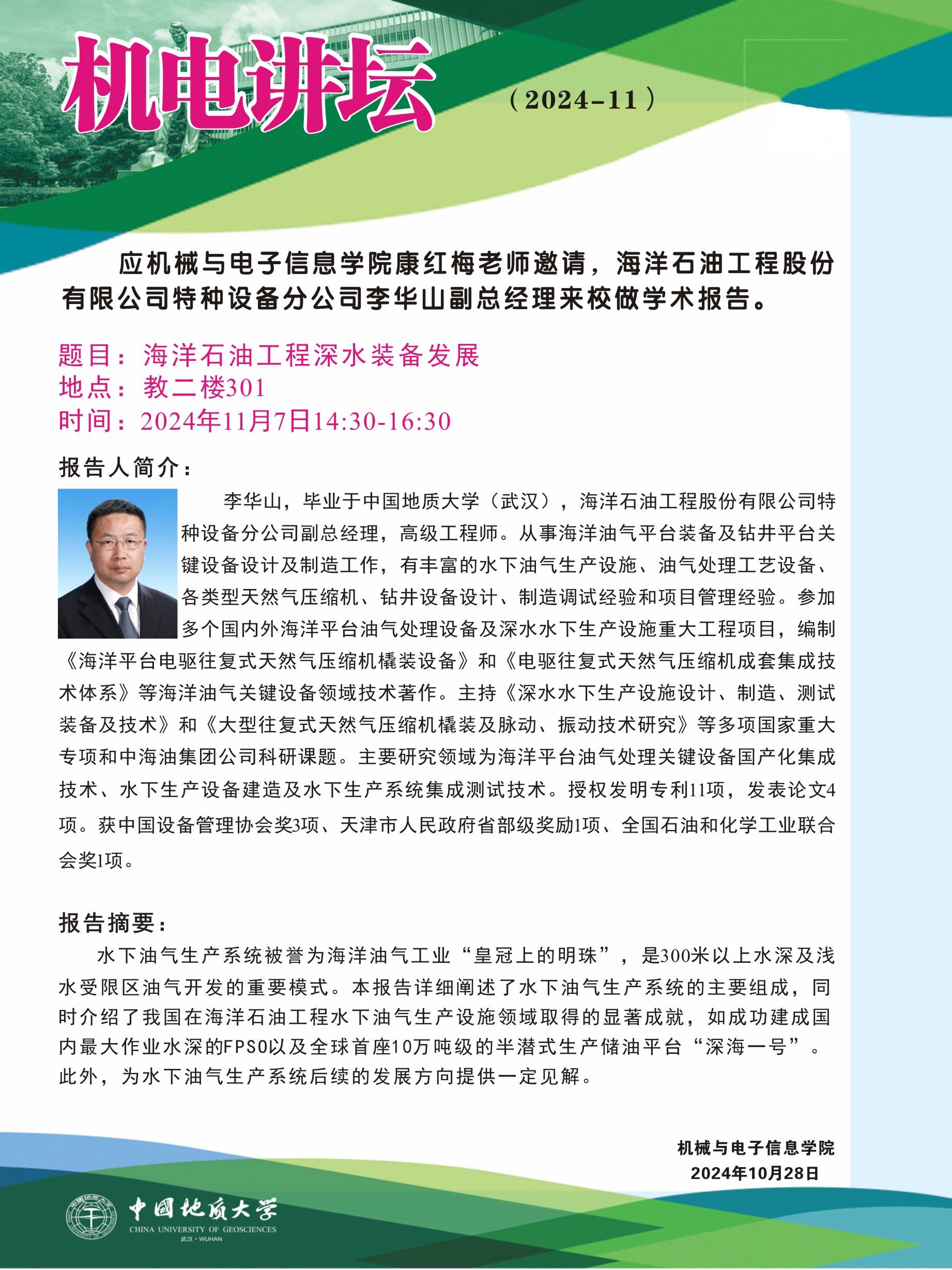 【11月7日】机电讲坛(2024-11):海洋石油工程股份有限公司特种设备分公司李华山副总经理来公司作学术报告