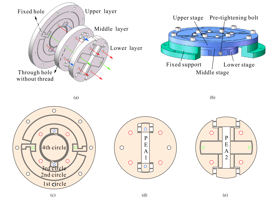 针对以上问题,文章提出了一种基于柔顺机构设计的无耦合纯转动的双行程精密定位平台。该平台设计来源于曲柄滑块机构,平台的转动机构由柔顺化的曲柄滑块机构组成。平台转动机构采用内外嵌套设计,以同时实现较大的输出行程和较高的位移精度,平台内圈为小行程转动机构,外圈为大行程转动机构。平台采用分层设计,由上下三层构成,以获得更加紧凑的结构设计,平台上层为转动部分,中层和下层分别作为驱动部分驱动小行程转动机构和大行程转动机构。通过内外嵌套设计、上下分层设计和整体对称布置,所设计平台的耦合误差达到了可忽略的量级,平台的大行程和小行程分别为[0 mrad, 17.40 mrad]和[0 mrad, 0.88 mrad],新型的无耦合纯转动的双行程精密定位平台得以实现。