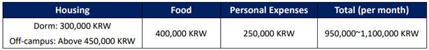 费用:免学费,住宿费公司按照6000元人民币/人(安山校区)、12000元人民币/人(首尔校区)标准予以资助,隔离费用全额资助,其他费用自理。