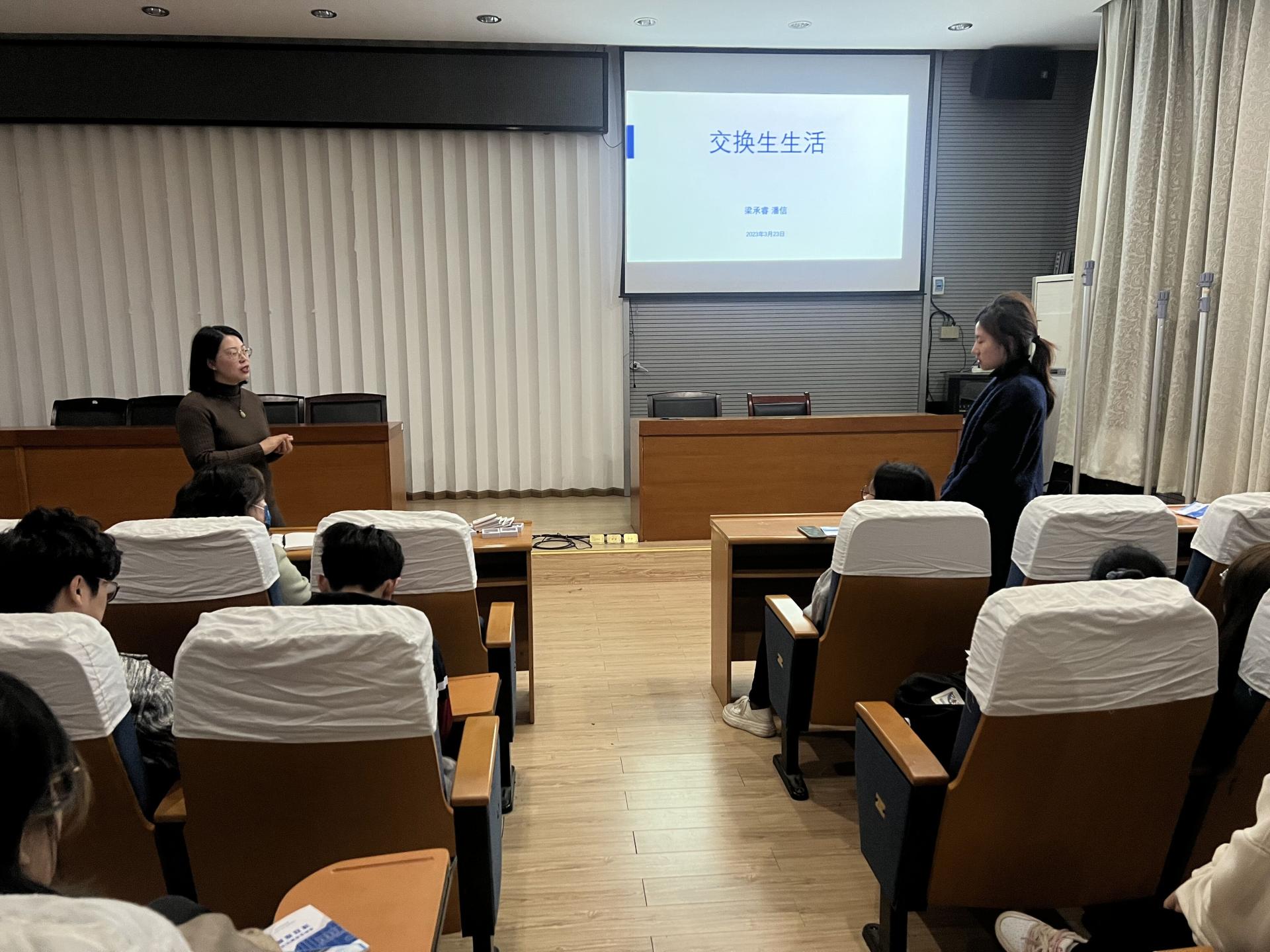 最后,曾经参加过韩国汉阳大学交换生项目的公司梁承睿和潘信同学为大家分享了在汉阳大学交换学习的点点滴滴。作为学长,他们分享了在韩国的学习、考试、生活、当地文化体验,还为学弟学妹们制作了申请策略,提供了参加国际交流的时间规划参考。梁承睿同学还为大家分享了自己制作的视频,他用精彩的短片记录了自己的交换生生活和韩国济州岛之行,并鼓励学弟学妹们只要想出国,不要害怕,勇敢迈出第一步。