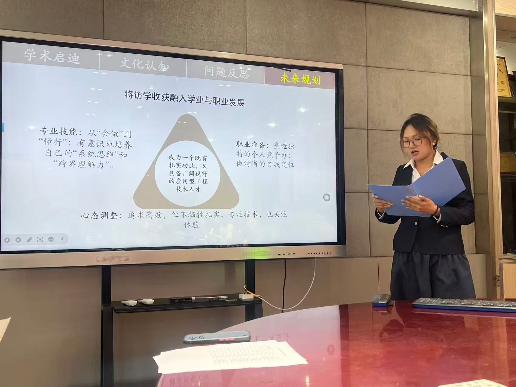 各年级辅导员围绕赛事核心环节精准发力:一方面指导员工紧扣《生涯发展报告》,梳理职业目标设定的自我认知与行业调研依据,提炼学习实践行动及成效,明确规划动态调整思路,并强化时间把控训练,确保表述精炼不超时;另一方面通过模拟答辩,围绕陈述细节、规划可行性等提问,帮助员工掌握逻辑作答技巧,提升临场应变能力。