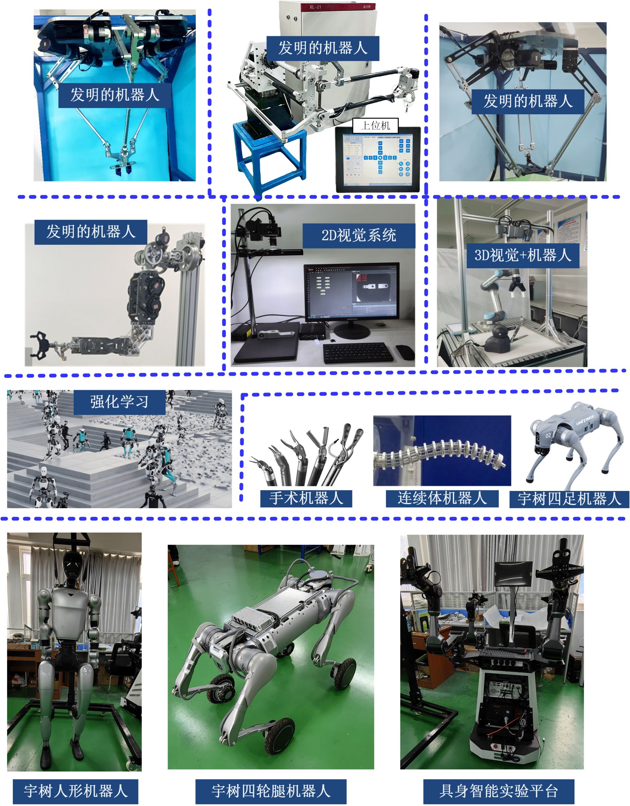 是公司最早从事机器人研究的老师,创建了智能机器人实验室,自主发明并成功研制了并联机器人、混联机器人、仿人机械臂、连续体机器人等。在地大,这里的机器人技术最专业、技术底蕴最深。实验室还有人形机器人,四足机器人,四轮足机器人,两足机器人,遥操作机器人,协作机器人,3D视觉系统,深度学习工作站等具身智能开发平台。